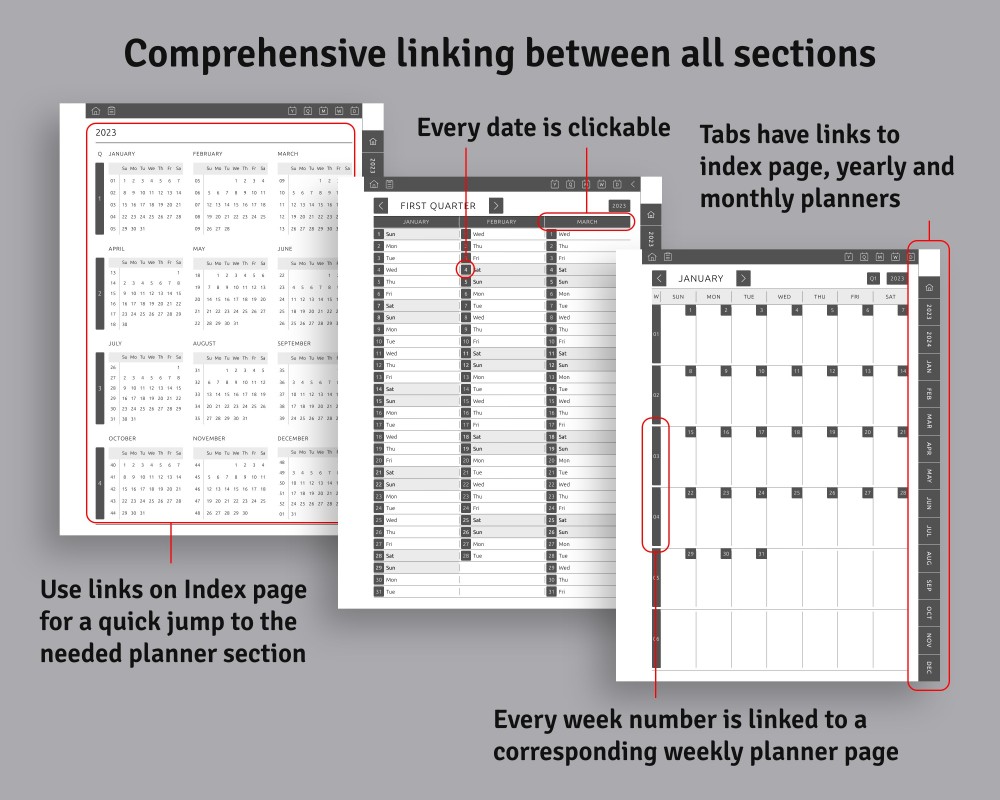 You can select and customize additional layouts for the planner, thereby making it even more functional and fully meeting your requirements. Plan your daily to-do lists, write down your goals, track the progress of tasks, leave notes, use the calendar, mark the days for which scheduled events are, etc.