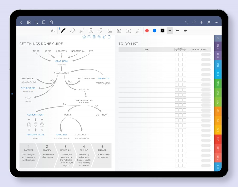 Experience the power of our user-friendly planner, expertly crafted with the renowned Getting Things Done methodology. Prioritize your to-do list seamlessly, break down complex projects into manageable tasks, and stay focused on what truly matters. With our planner as your ally, you gain essential tools to take control of your time, maximize efficiency, and effectively conquer your goals.