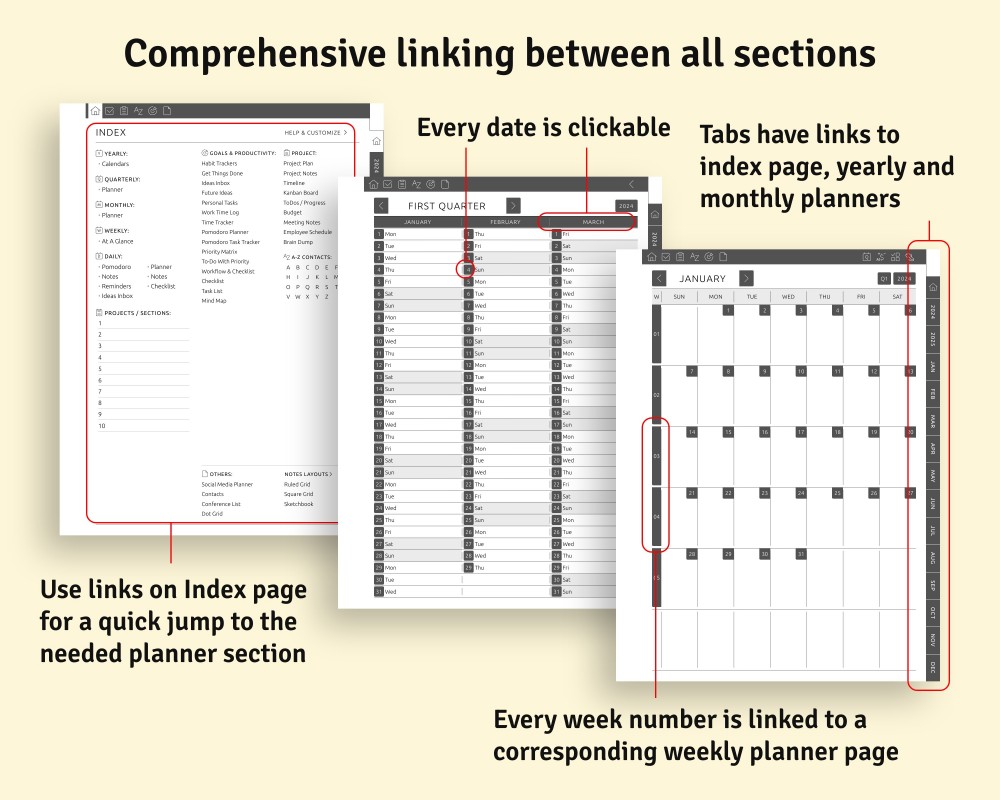 Experience the simplicity of navigating your reMarkable Client Record Book Planner with our intelligent hyperlinked structure. Designed for optimal user-friendliness, it's now effortless to locate your daily tasks, project timelines, or monthly objectives. With just a few clicks, our customizable planner seamlessly connects you to exactly what you need, enhancing your planning experience like never before.