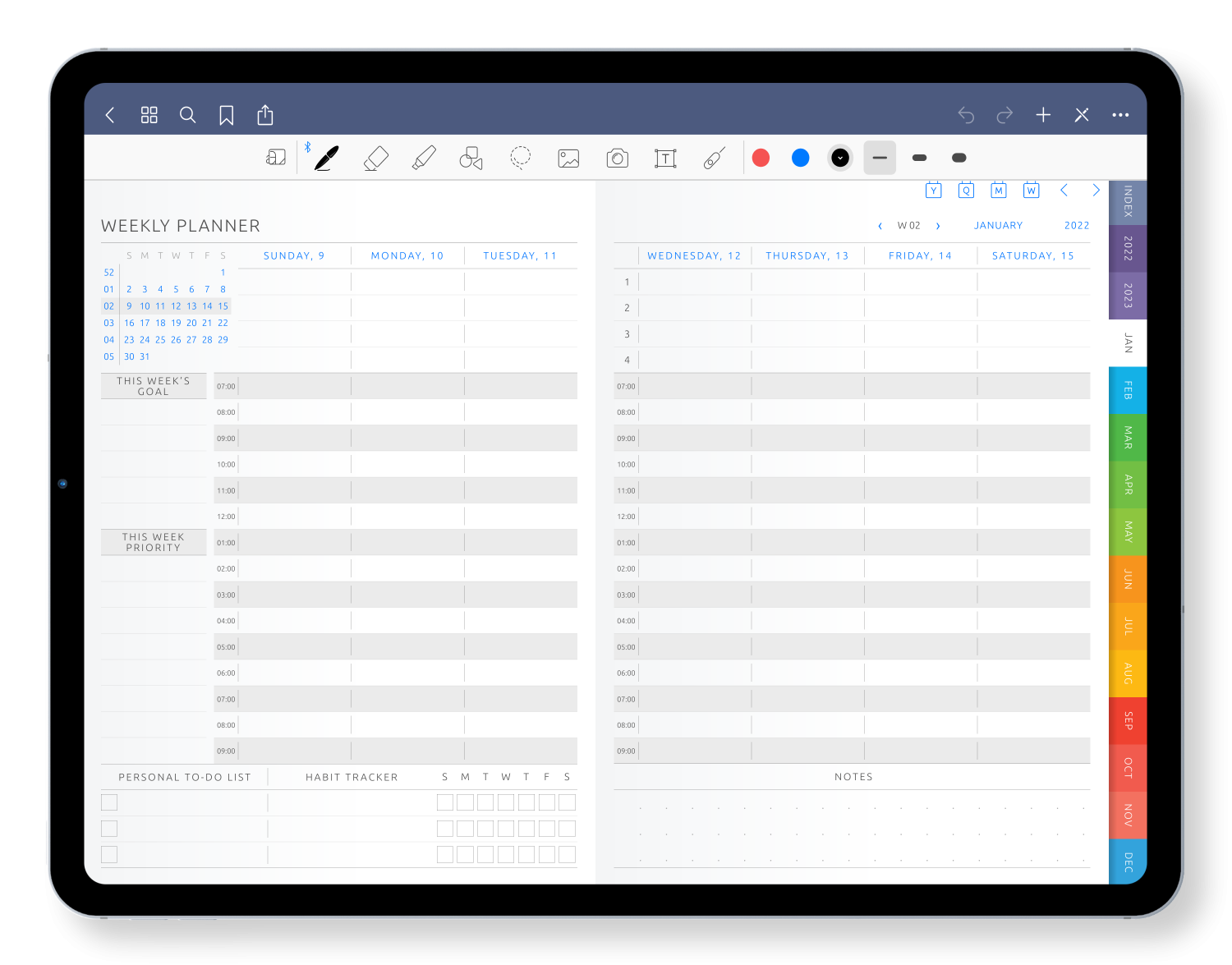 Choose from 5- and 7-day layouts with options for time-blocking, task lists, note space, and more.